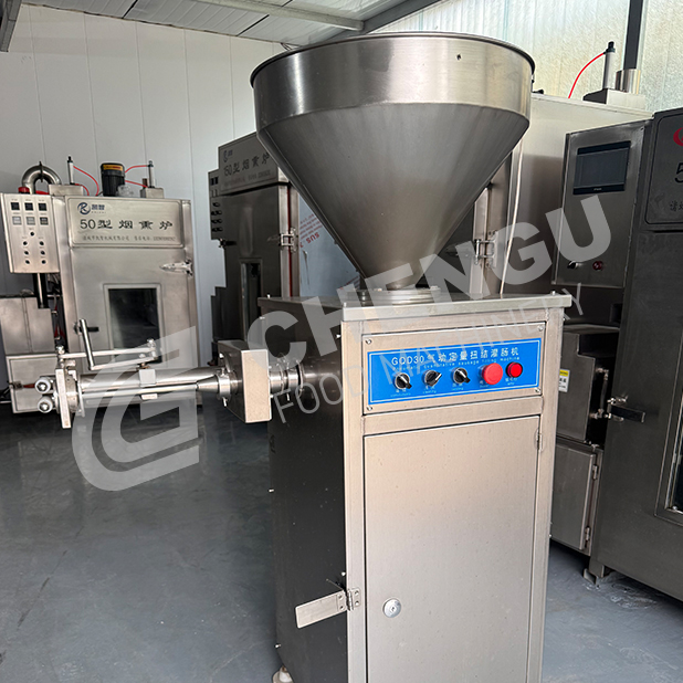 Pneumatic Quantitative Knotting Sausage Filling Machine adopts advanced technology and utilizes pneumatic and photoelectric control principles to continuously and automatically fill and knot various ham products. It is suitable for filling natural casings, collagen casings, smoked casings, etc.